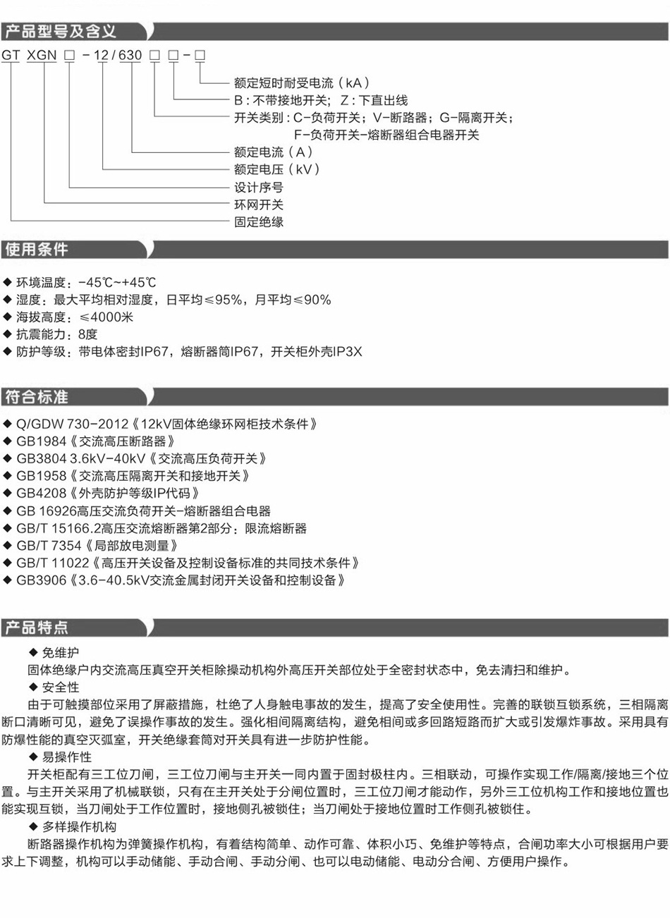 本開關(guān)滿足IEC298. GB3906-2006, GB1984等標(biāo)準(zhǔn)要求。其開關(guān)及主要元器件為集成模塊,相間導(dǎo)電部位間為固體絕緣封裝。高壓斷路器的操作機(jī)構(gòu)采用彈贊?rùn)C(jī)構(gòu)或永班機(jī)構(gòu),機(jī)械壽命為,0000次。其所有運(yùn)行數(shù)據(jù)及設(shè)備狀況都可實(shí)現(xiàn)遠(yuǎn)程監(jiān)側(cè)監(jiān)控.可以無人值守,實(shí)為一種性能優(yōu)越的配電裝,。
